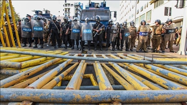 BOGOTA, COLOMBIA - MAY 05: Protesters clash with riot police officers at Bolivar square during the national strike against the tax reform proposed by Duque's administration on May 05, 2021, in Bogota, Colombia. Tens of thousands of Colombians have taken to the streets in demonstrations that began last Wednesday against a proposed tax reform but have since morphed into broader protests against the government of President Ivan Duque. The international community on Tuesday decried what the UN described as an "excessive use of force" by security officers in Colombia after numerous deaths during days of anti-government protests. ( Juancho Torres - Anadolu Agency )