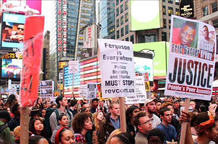 Demonstrators marched from Manhattan's Union Square to Times Square, where they staged a four-minute die-in – one minute for each hour that Brown's body was left uncovered in the street after being killed.