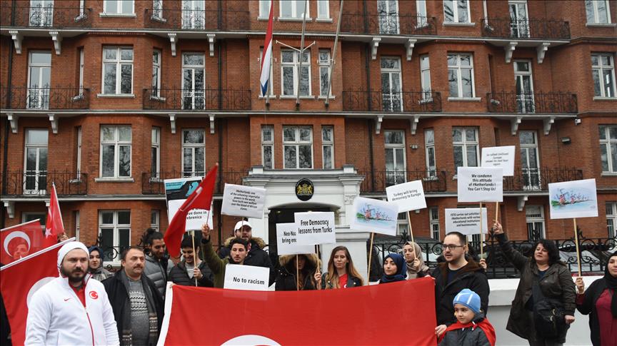 A Turkish student group in London on Sunday protested Dutch government's ban on Turkish ministers, which triggered a tension between the two countries.