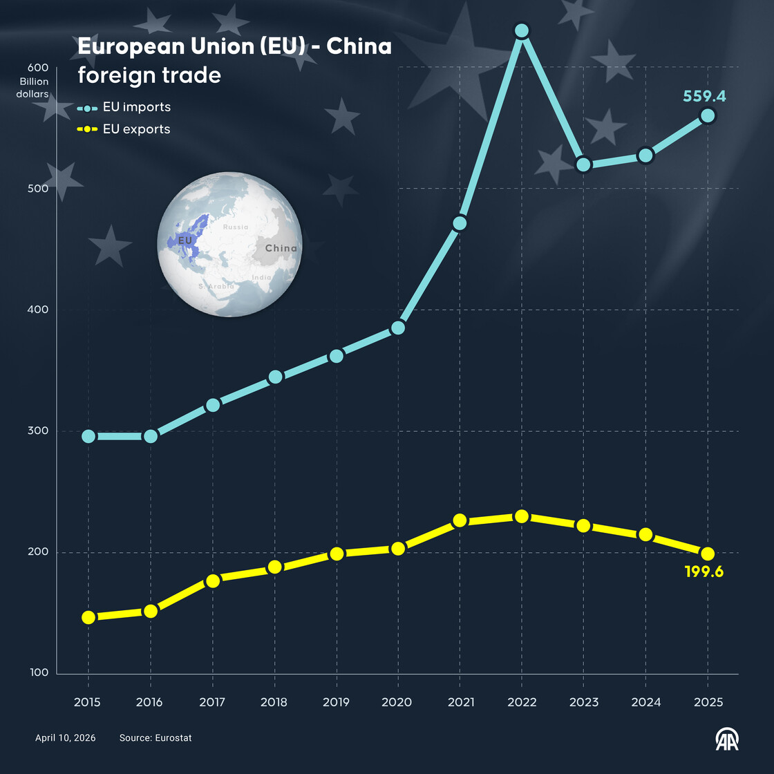 According to Eurostat data, the European Union exported goods worth €199.6 billion to China in 2025, while imports reached €559.4 billion. The total trade deficit amounted to €359.8 billion.Mehmet Yaren Bozgun