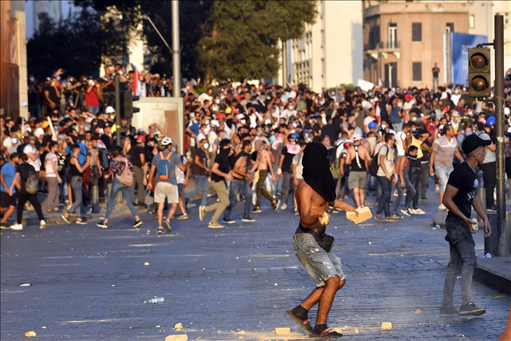 LBEIRUT, LEBANON - AUGUST 04: Lebanese security forces intervene in protesters as Lebanese people gather for the Beirut port explosion march toward the port on an anniversary commemoration on August 04, 2021 in Beirut, Lebanon. Whilst investigations for accountability continue, Lebanese commemorate the 218 people who died and 7 000 injured on August 04, 2020 when 2750 tons of ammonium nitrate exploded in the port of Beirut. The blast, one of the largest non-nuclear explosions in world history, displaced 300,000 people and damaged buildings up to 20km away. ( Hussam Shbaro - Anadolu Agency )
