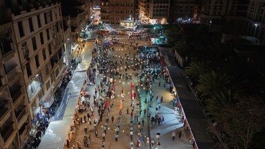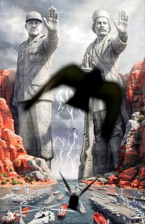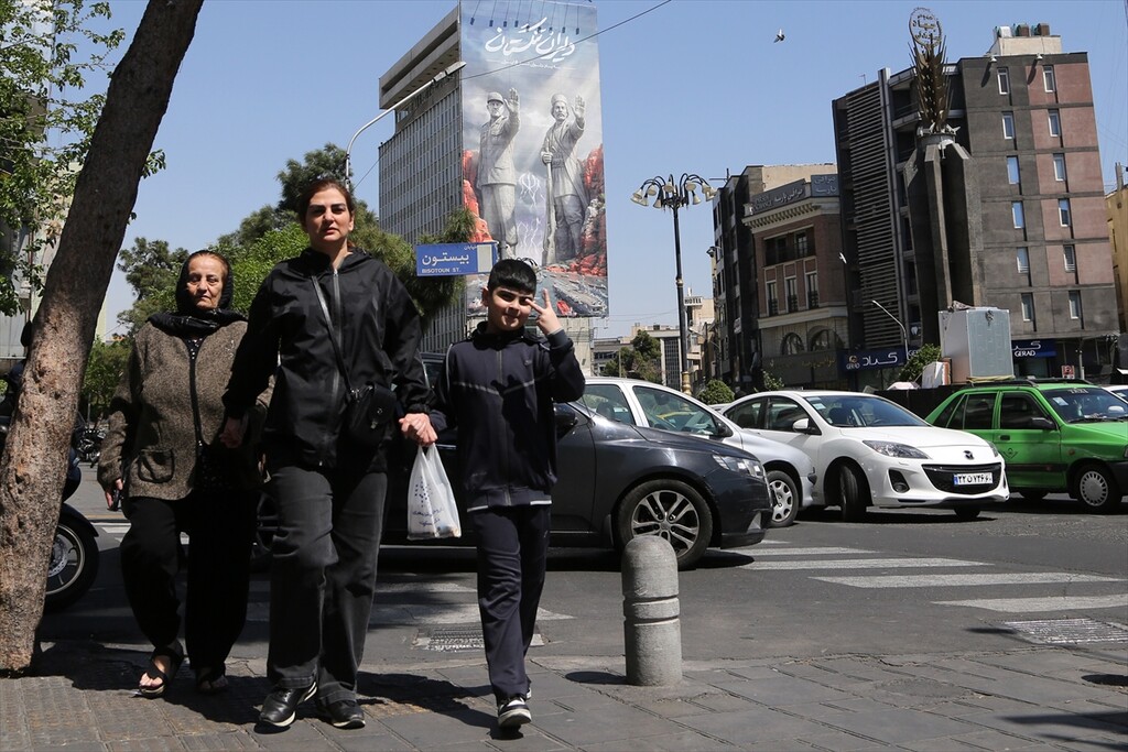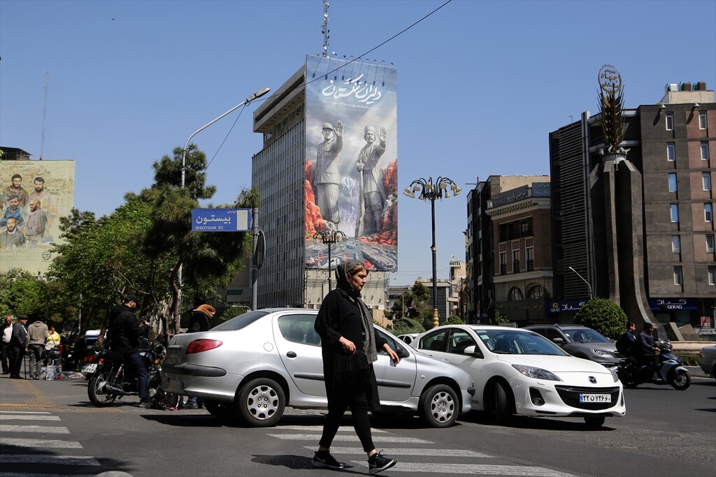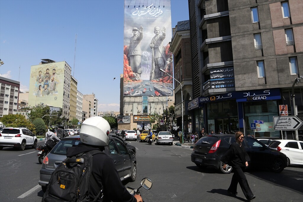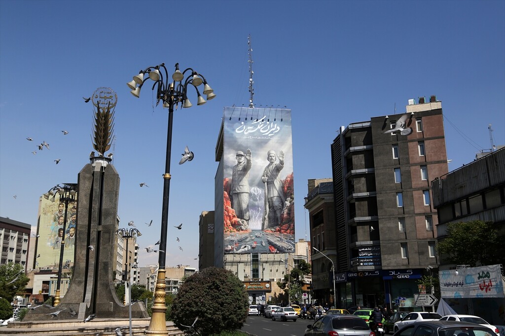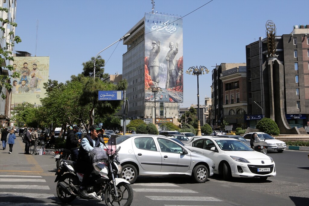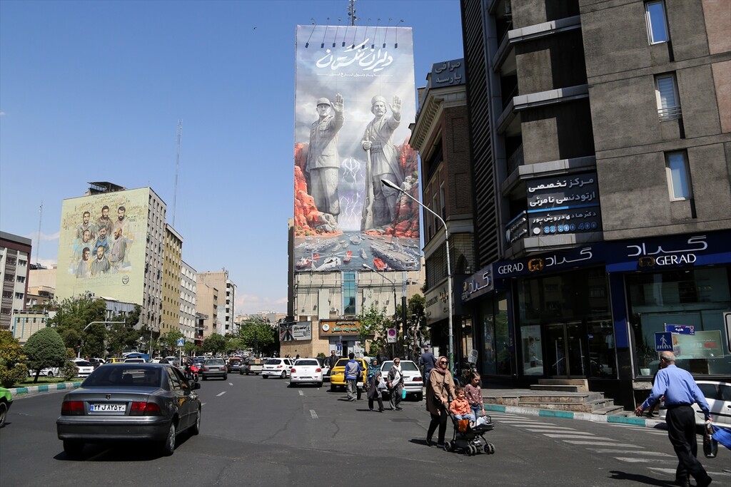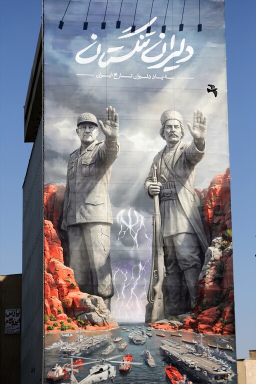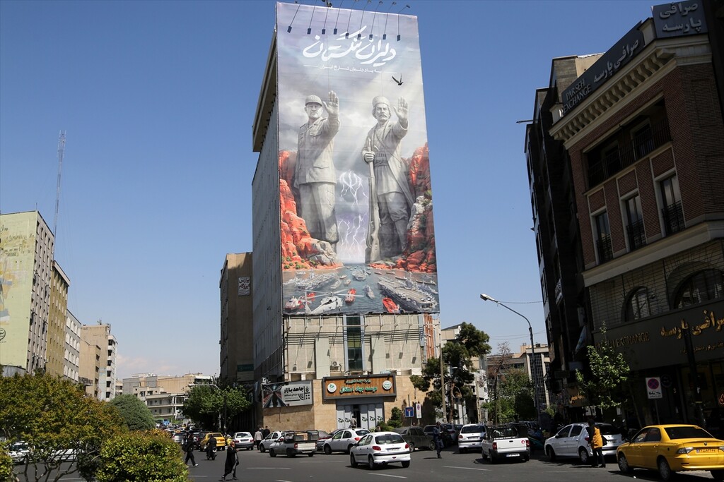 A giant banner depicting the Strait of Hormuz is displayed at Fatemi Square, featuring Ali Reza Tangsiri, commander of the Islamic Revolutionary Guard Corps Navy who was killed in a US-Israeli attack.