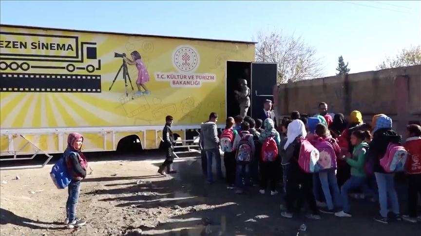 Turkey's Defense Ministry released a video on Friday showing children watching a movie at a mobile cinema in a Syrian town cleared of terrorists by a Turkish military operation.