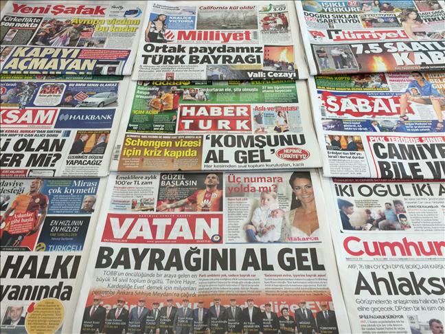 MILLIYET’s headline read: “Our common ground is [the] Turkish flag” while economic newspaper DUNYA wrote: “No to terror, yes to brotherhood.”