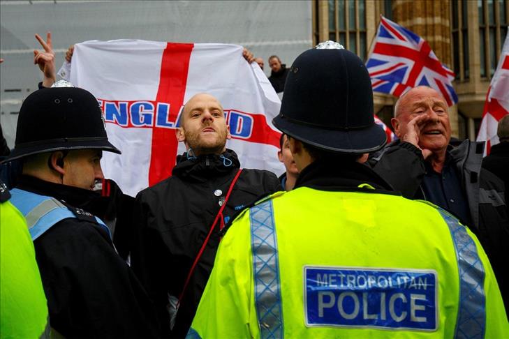 BBC News reported 17 arrests as demonstrators threw smoke bombs, traffic cones and tomato ketchup at police. Four officers and a civilian police worker were injured.