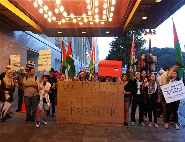 Waving Palestinian flags and chanting anti-Israel slogans, the protesters gathered outside the Hilton Hotel where the Chicago division of the Jewish United Fund had organized a rally and fundraising event billed "Chicago Stands with Israel."