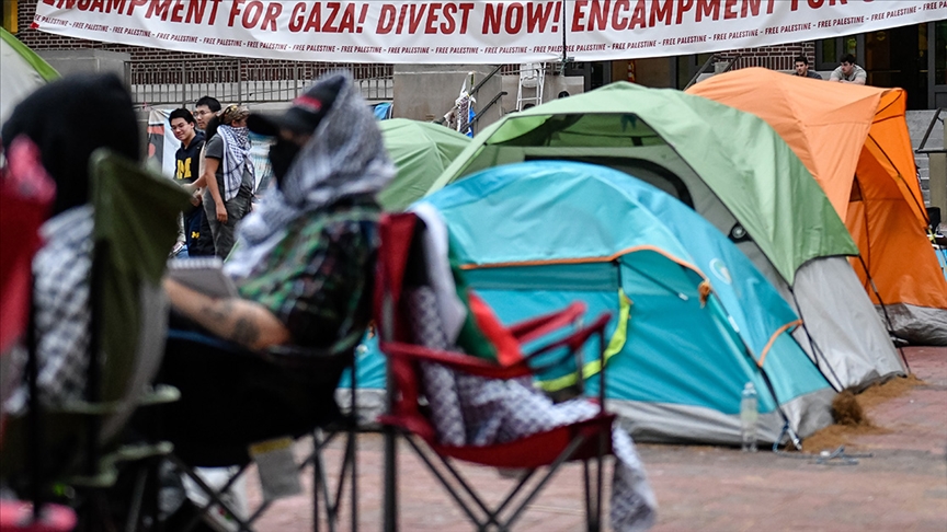 Michigan Üniversitesi öğrencileri, üniversitenin İsrail'le bağlantılı yatırımlarına son vermesi talebiyle kurdukları dayanışma kampıyla Filistin'e desteklerini sürdürüyordu.