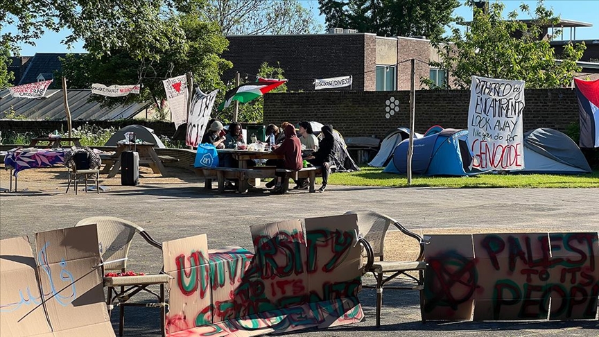 Utrecht Üniversitesi Kütüphanesinin avlusunu işgal eden göstericiler, 7 Mayıs'ta binanın girişine barikat kurarak Filistin'i destekleyen pankartlar asmıştı.