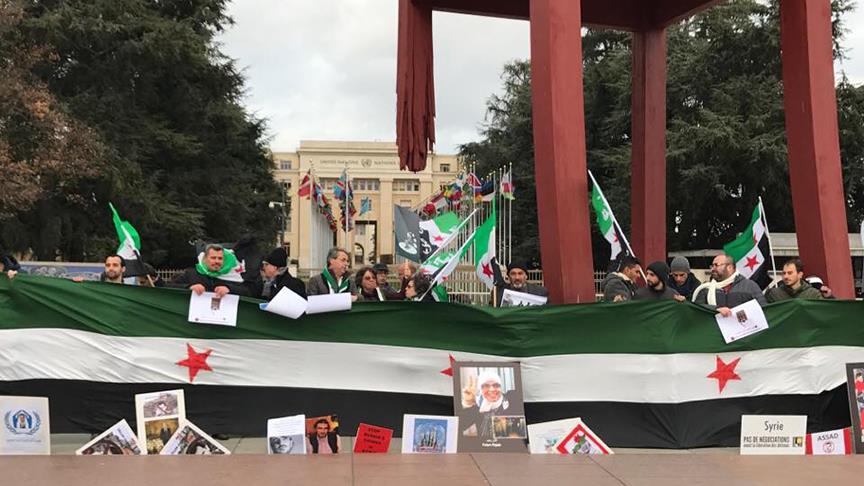 BM Cenevre Ofisi önünde, sivillere yönelik silahlı şiddete karşı mücadeleyi simgeleyen "kırık sandalye heykeli"nin bulunduğu meydanda, Avrupa'nın farklı ülkelerinden gelen Suriyeliler, Esed rejimine karşı gösteri düzenledi.