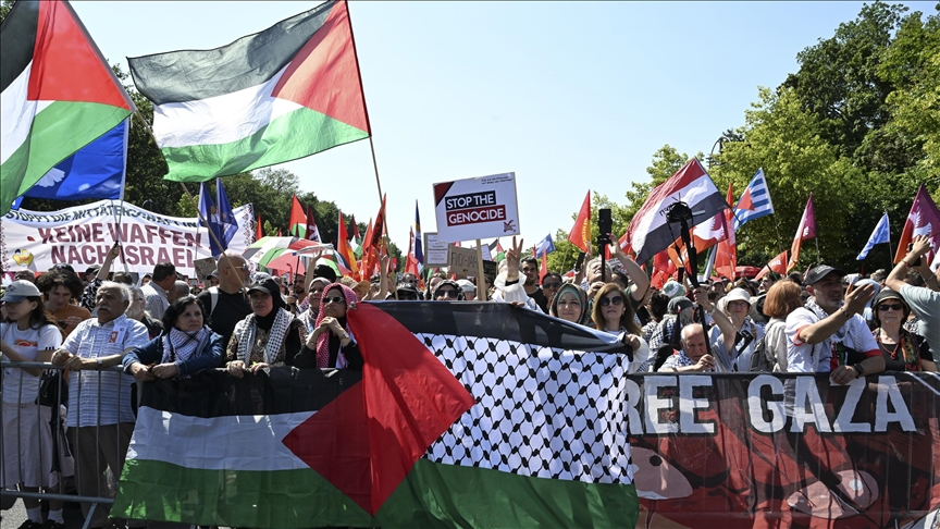 Şehir merkezindeki tarihi Brandenburg Kapısı ile Zafer Anıtı arasındaki 17 Haziran Caddesi'nde toplanan binlerce Filistin destekçisi, İsrail’in Gazze’ye yönelik saldırılarını, Gazze halkının aç bırakılmasını ve Filistinlilerin yerlerinden edilme planlarını protesto etti.