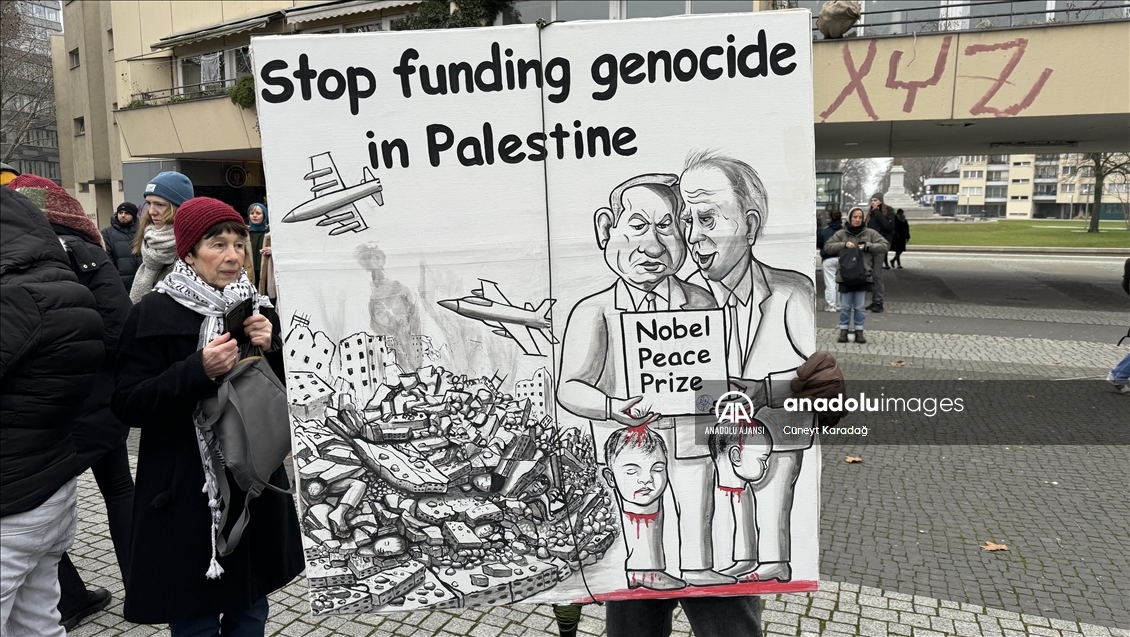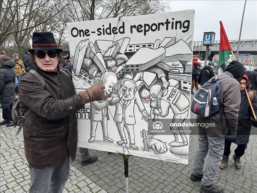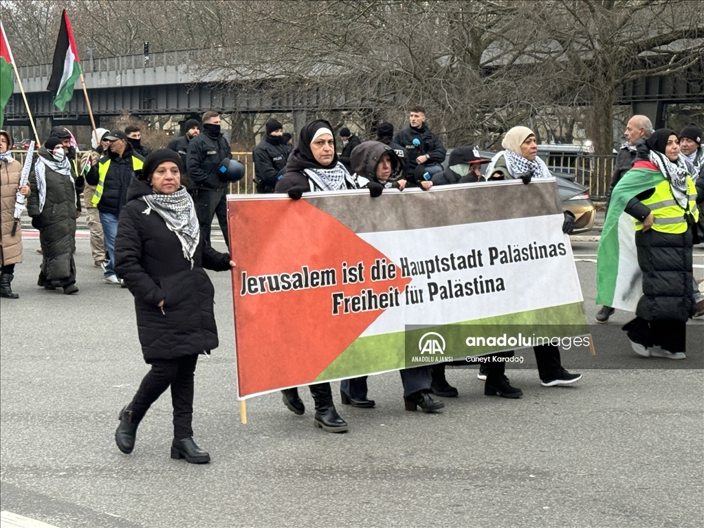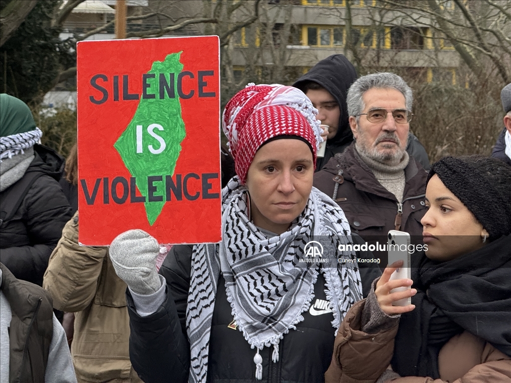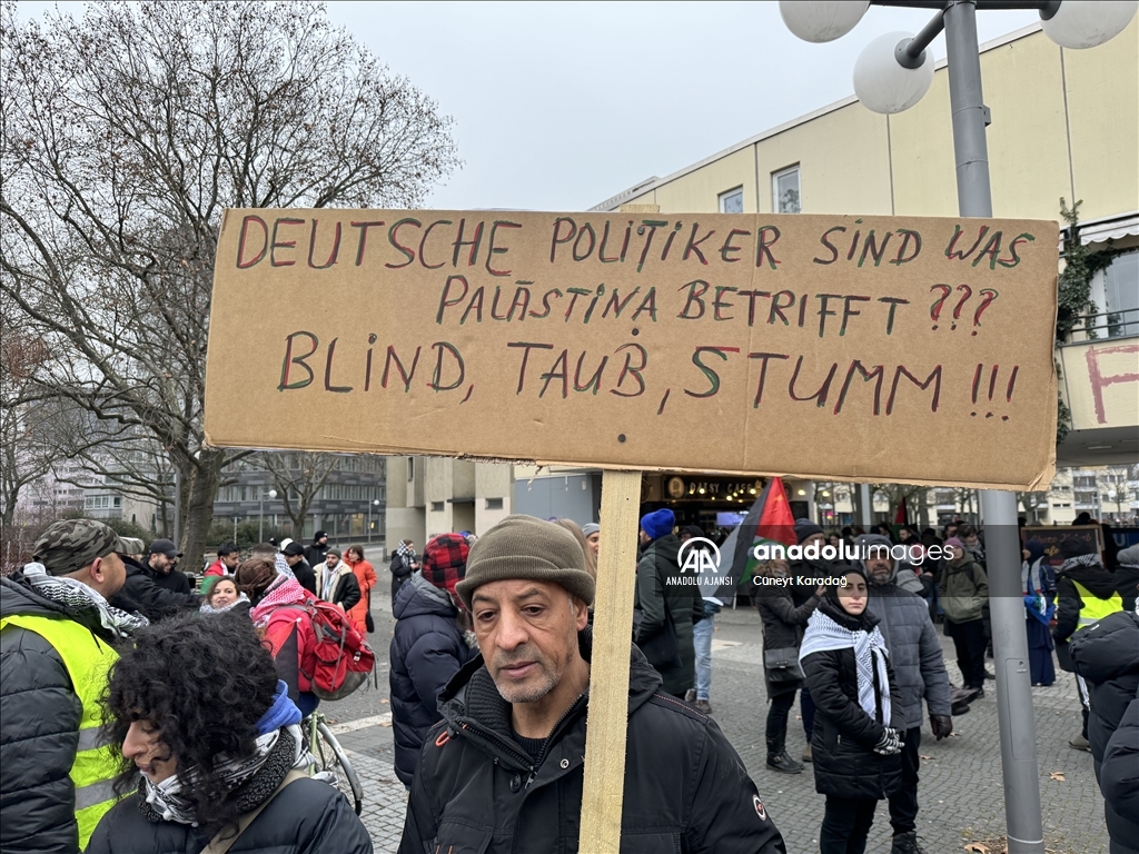Mehringplatz Meydanı'nda toplanan yaklaşık 1500 gösterici, Filistin'e destek mesajları verdi, İsrail'in Gazze'ye saldırılarını protesto etti.