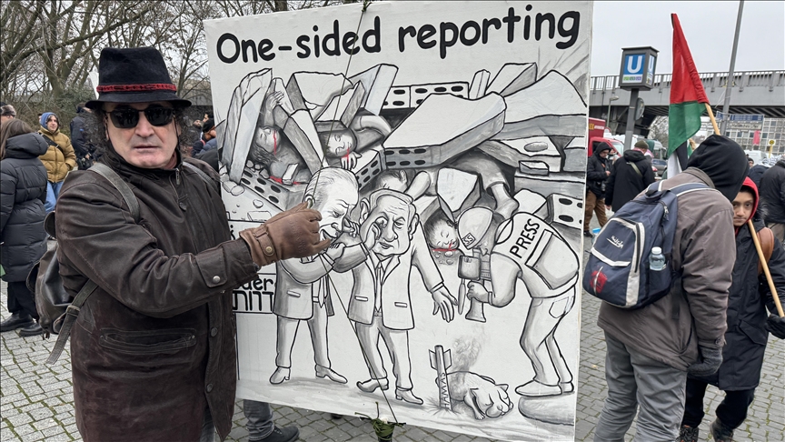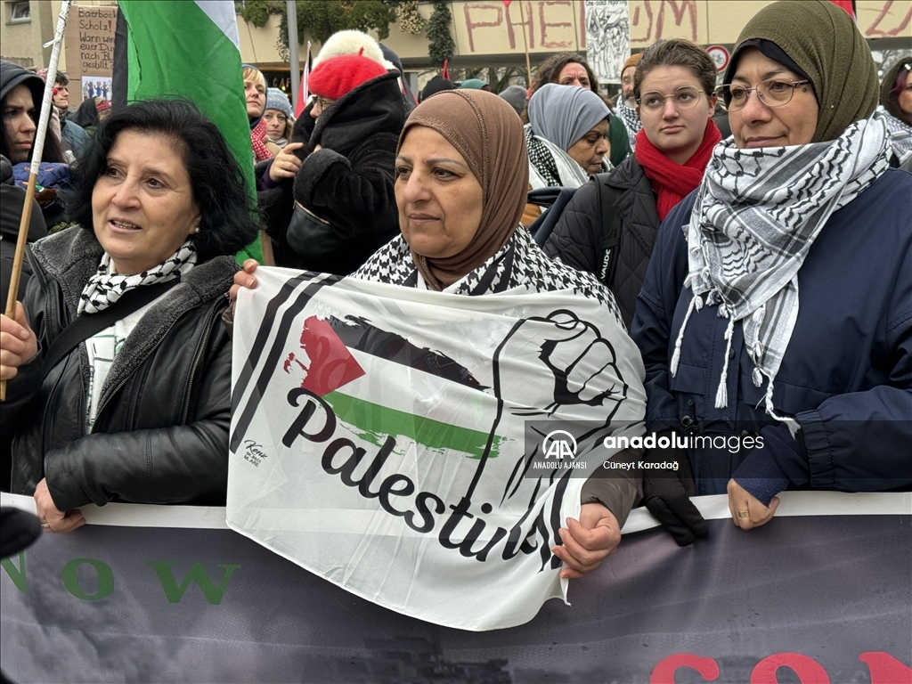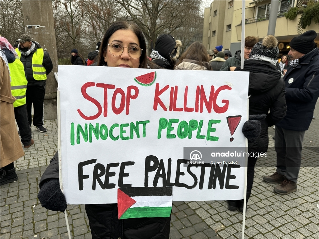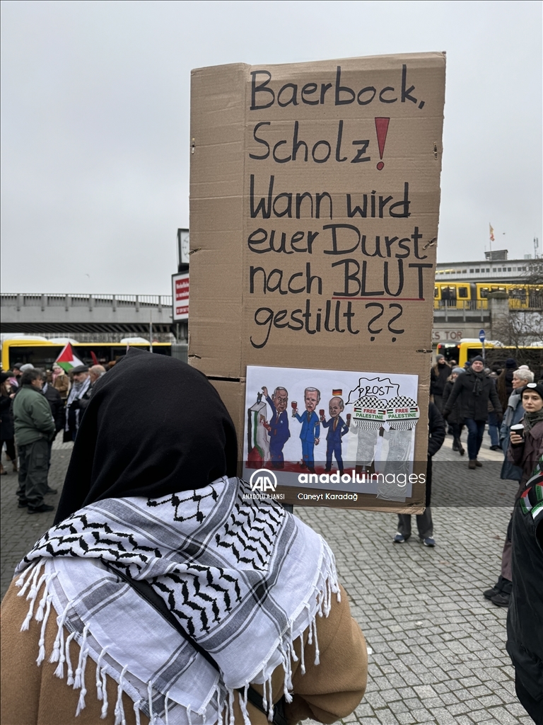 Göstericiler, Filistin bayrakları ile "Masum insanları öldürmeyi durdurun", "Başbakan Scholz, Dışişleri Bakanı Baerbock ne zaman kana doyacaksınız?", "Alman politikacılar Filistin'e sessiz, sağır ve kör", "Gazze'de işgale son verin" ve "Çocukların toplu mezarları üzerine kutsal topraklar inşa edemezsiniz" yazılı döviz ve pankartlar taşıdı.