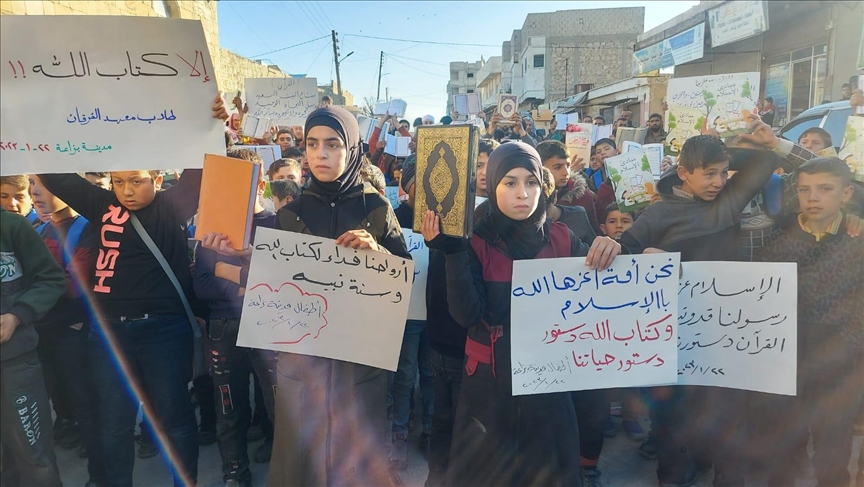 Suriye’nin kuzeyindeki Bizia, Çobanbey ve Mare’de binlerce kişi, İslami değerlere yönelik yapılan saygısızlığa karşı protestolara katıldı.