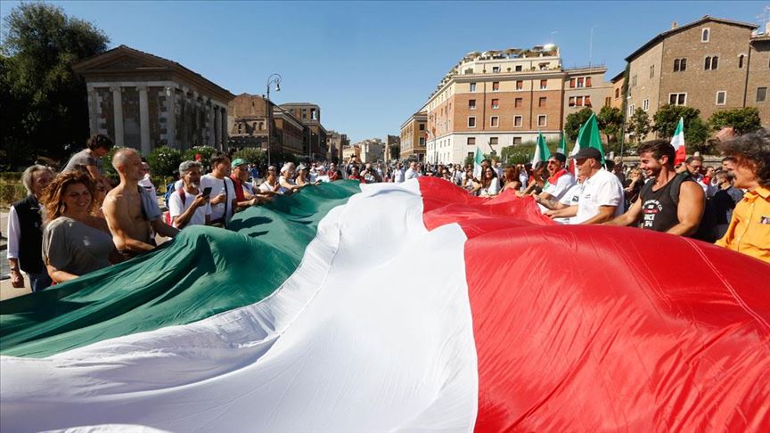 Başkent Roma'nın Bocca della Verita Meydanı'nda toplanan ve kendilerini "İnkarcılar" olarak adlandıran, aşırı sağ grupların da dahil olduğu yaklaşık 2 bin kişi, "Sağlık diktatörlüğüne karşıyız" adıyla Kovid-19'a yönelik önlemleri protesto etti.