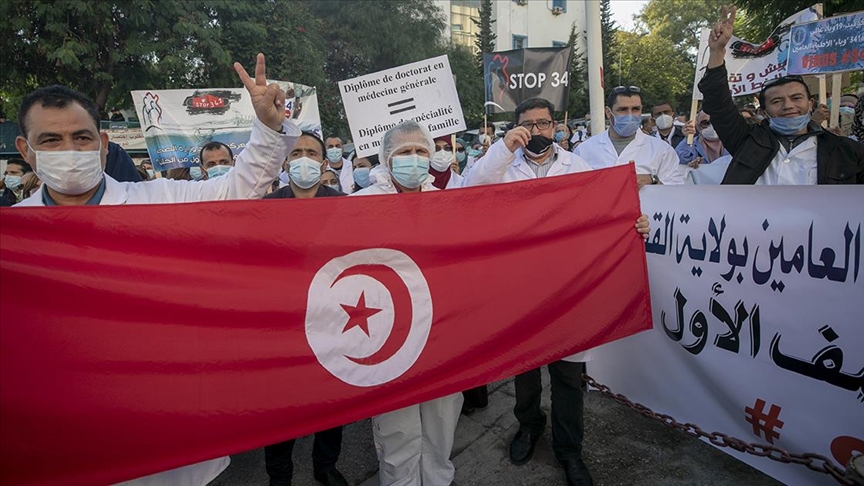 Başkent Tunus'taki Sağlık Bakanlığı binası önünde toplanan çok sayıda doktor, "doktorlar dayanışma içinde", "doktorları ötekileştirmeye hayır" ve "sağlık personeline yeterli karantina imkanı sağlansın" yazılı dövizler taşıyarak, mevcut kanuna göre sınavla olan uzman doktorluğa geçişin sınavsız ve doğrudan olmasını talep etti.