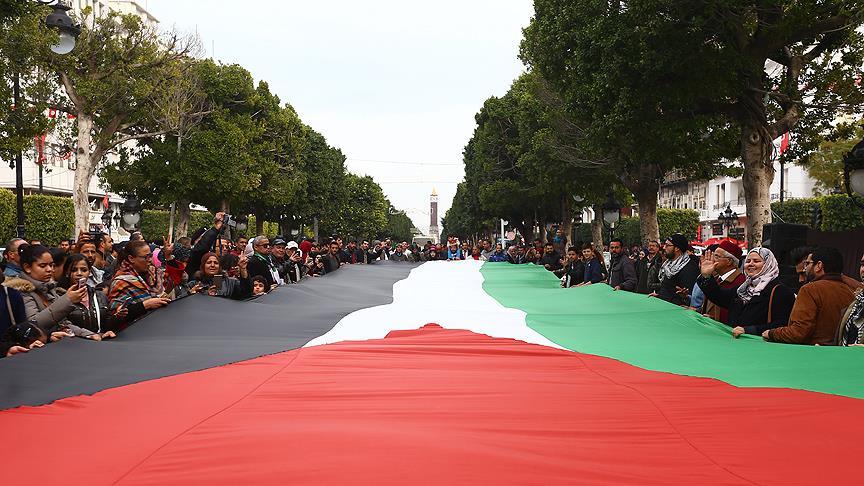 Filistin için Tunuslular Koalisyonunun, başkent Tunus'taki Belediye Tiyatrosu önünde düzenlediği gösteriye katılanlar, üzerinde "Halk, Filistin'in kurtulmasını istiyor", "Halk normalleşmenin suç sayılmasını istiyor" yazılı dövizler taşıdı.