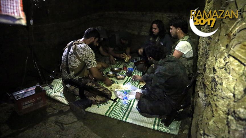 İftar saati, iki kişi sığınak girişinde nöbet tutarken, diğerleri yemeğini yiyor. Çoğu rejim saldırılarıyla yıkılan bölgedeki camiler kullanılamadığından ezanı sığınakta okuyan Türkmenler, sırasıyla iftarlarını açıyor. Namazı da sığınakta kılan Türkmenler, saldırı bitinceye kadar mağarayı andıran bu tünellerden çıkmıyor.