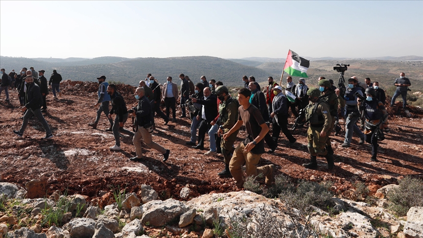 İsrail askerlerinin koruması altındaki yerleşimciler, "İsrail topraklarında olduğu" iddiasıyla Filistinli çiftçilerin tarlalarına zeytin ağaçları dikmelerine izin vermedi.
