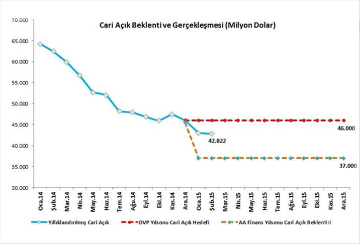 Türkiye Cumhuriyet Merkez Bankası (TCMB) tarafından açıklanan cari işlemler açığı, 2015 yılı şubat ayında 146 milyon dolar azalarak 3 milyar 196 milyon dolar oldu. Bunun sonucunda on iki aylık cari işlemler açığı, 42 milyar 968 milyon dolardan 42 milyar 822 milyon dolara geriledi.