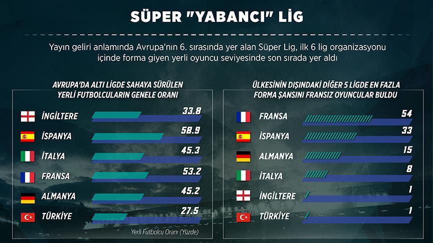 Avrupa'da en fazla yayın gelirine sahip 6. lig konumundaki Süper Lig'de, ilk beş lige oranla daha az yerli futbolcu forma giydi.