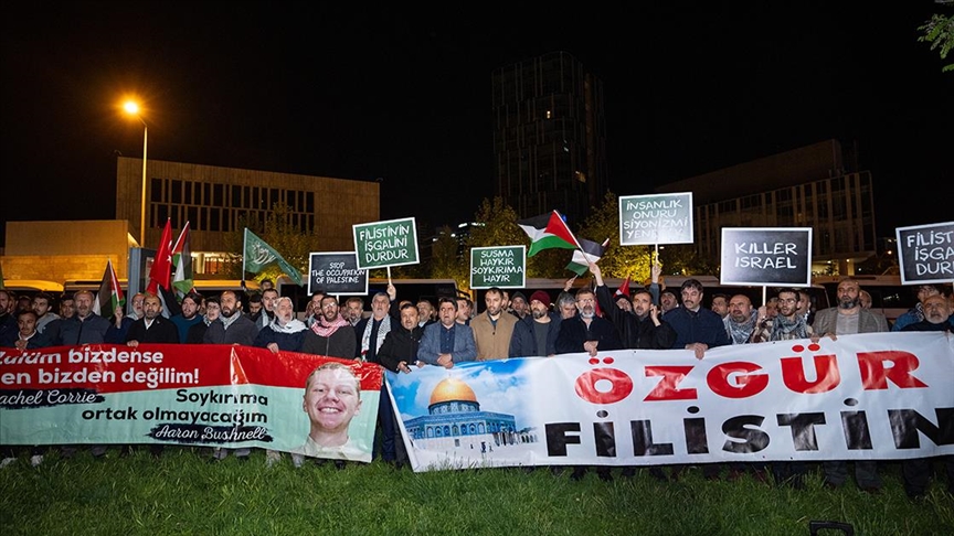 "Refah'ta Katliama Hayır" sloganıyla İsrail'i protesto eden grup "İnsanlık onuru siyonizmi yenecek", "Susma haykır, soykırıma hayır" sloganları attı.