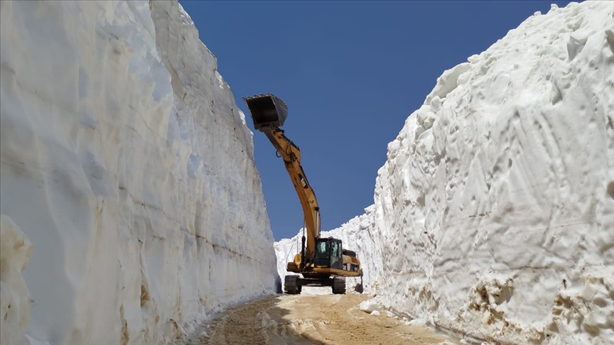 Haziran ayının son günlerinde de kar kalınlığının yer yer 8 metreyi bulduğu bölgede zor koşullarda çalışma yürüten ekipler, bazı noktalarda ekskavatör kullanarak ilerleyebiliyor.