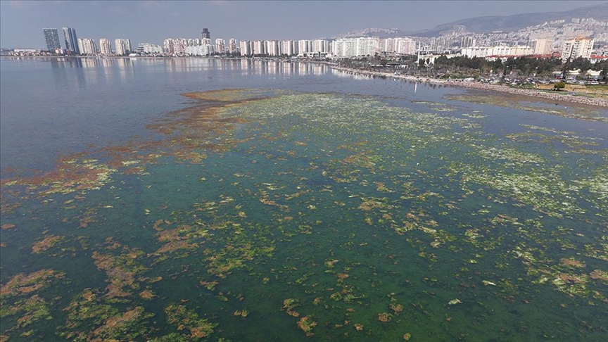 İzmir Körfezi'nin Bostanlı sahili tarafında, deniz suyundaki azot ve fosfor miktarının artmasıyla çoğalan deniz yosunu (Ulva lactuca) su yüzeyinde yeşil bir örtü oluşturdu.