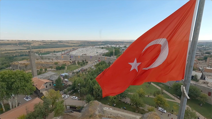 Hurri-Mitanniler, Urartular, Persler, Romalılar, Emeviler, Abbasiler, Mervaniler, Selçuklular ve Artukluların da aralarında olduğu birçok medeniyete ev sahipliği yapan Amida Höyük'te yükselen Türk bayrağının da kaydedildiği görüntüde, sur çevresinde terör saldırıları sonucu yıkılan konutların yerine yeni yapılan evler ve restore edildikten sonra sergi salonu olarak kullanılan Behram Paşa Hamamı da kadraja girdi.
