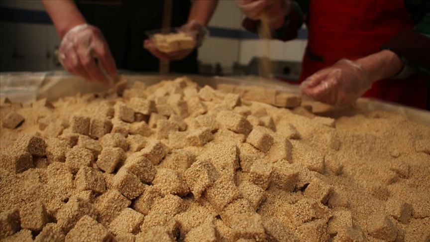 Kütahya'da bayram ikramlarının vazgeçilmez lezzetlerinden olan coğrafi işaretli susam ve tahinden küp şeklinde yapılan paşa helvası, 125 yıldır damakları tatlandırıyor.