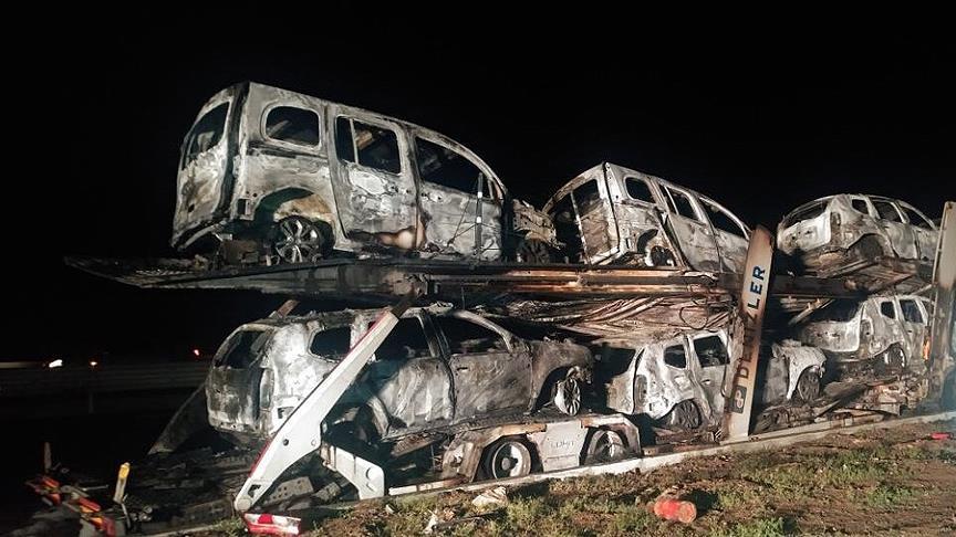Konya'da tırın alev alması sonucu üzerinde taşıdığı 7 yeni araç büyük hasar gördü.