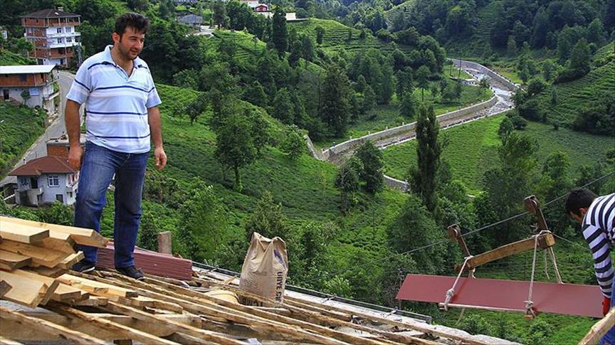 Rize'nin Derepazarı ilçesinde yaşayan çatı ustası Muharrem Sancaktutan, evinin çatısını kurduğu ilkel teleferikten faydalanarak onardı.