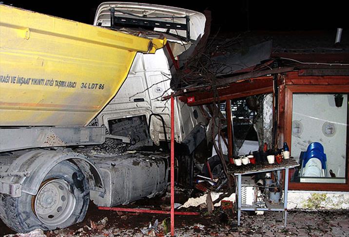 Kemerburgaz Mithatpaşa Mahallesi Selanik Bulvarı'ndan Göktürk istikametine giden Ergün Öncü'nün kullandığı 34 LDT 86 plakalı hafriyat yüklü kamyon, sürücüsünün direksiyon hakimiyetini kaybetmesi nedeniyle kaldırıma çarptı. Kaldırımdaki reklam panosunu devirdikten sonra duramayan kamyon, park halindeki iki otomobile çarparak yol kenarındaki balık restoranına girdi.