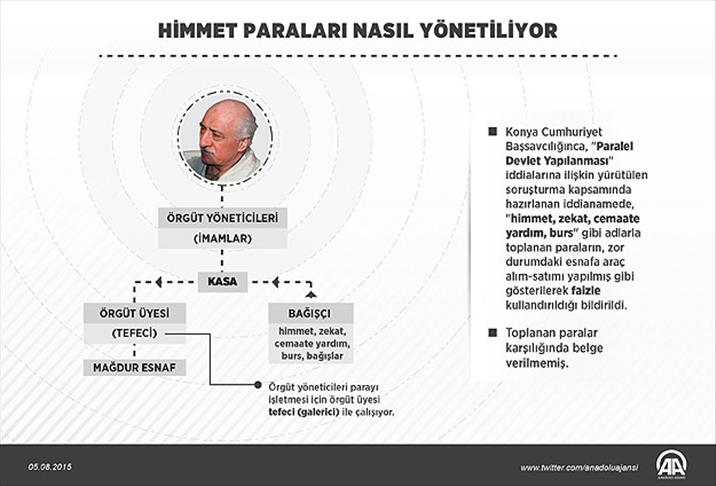 Konya Cumhuriyet Başsavcılığınca, "Paralel Devlet Yapılanması" iddialarına ilişkin yürütülen soruşturma kapsamında hazırlanan iddianamede, "himmet, zekat, cemaate yardım, burs" gibi adlarla toplanan paraların, zor durumdaki esnafa, araç alım satımı yapılmış gibi gösterilerek faizle kullandırıldığı bildirildi.