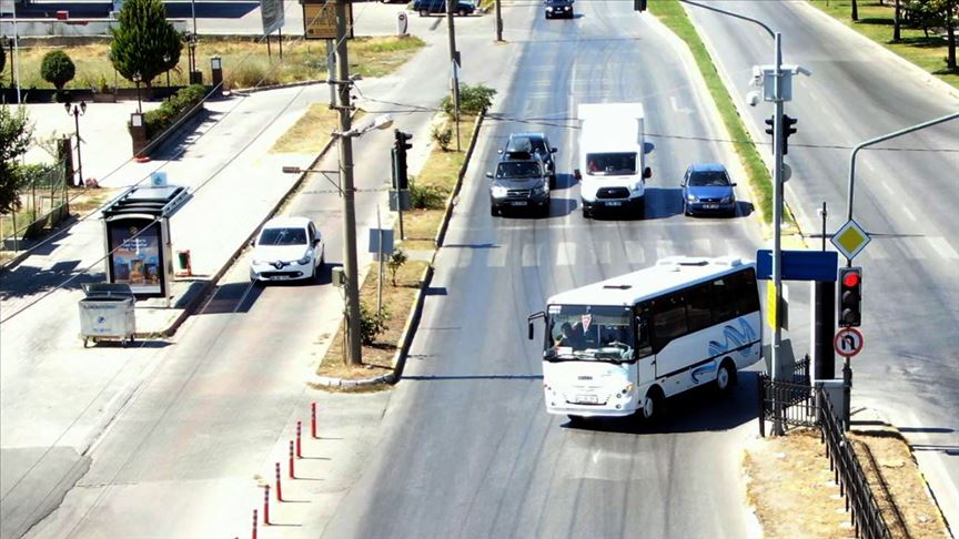 Polis ekipleri, kırmızı ışıkta durmayıp ışıkların yan tarafındaki minibüslerin yolcu indirme bindirme yolunu kullanan sürücüleri drone ile tespit etti.