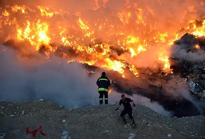 Manisa Katı Atık Depolama Alanı'nda yangın çıktı. Ekipler, yangının ormanlık alana sıçramaması için yoğun çaba harcıyor.