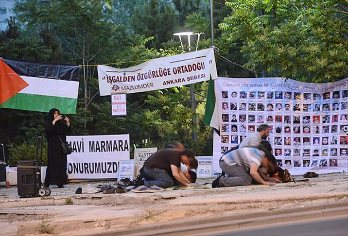 Filistin bayrakları taşıyan MAZLUMDER üyeleri, "Katiller hesap vermeden bu davadan vazgeçmeyiz", "Mavi Marmara onurumumuzdur" yazılı pankartlar açarak, "Mazlumların kanı zalimleri boğacak", "Katil İsrail, Ortadoğu'dan defol" sloganları attı.