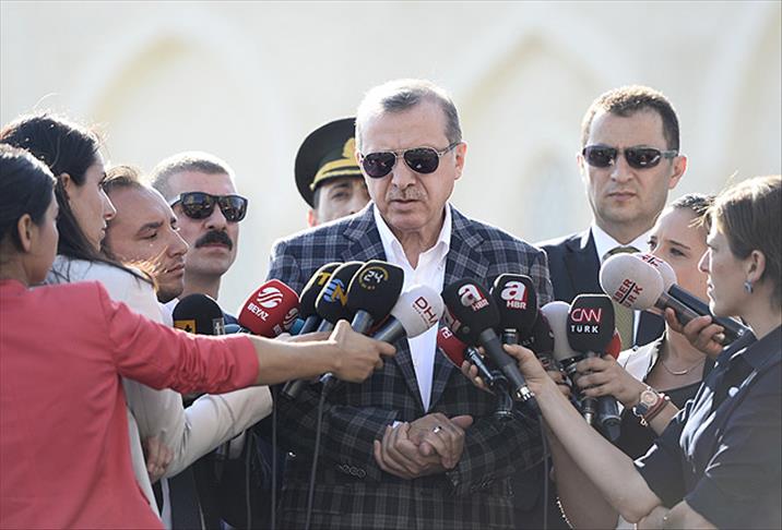 Erdoğan, bayram namazı sonrası gazetecilere açıklamalarda bulundu. Erdoğan, kendisini takip eden gazetecilerin Ramazan Bayramı'nı kutlayarak, "Tüm milletimin Ramazan Bayramı'nı tebrik ediyorum, tüm İslam dünyasının, tüm insanlığın barışına, huzuruna vesile olmasını temenni ediyorum" dedi.