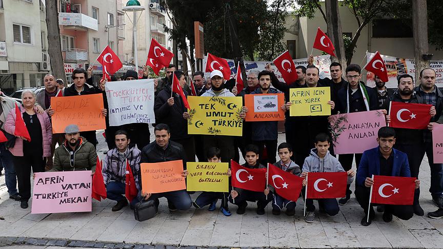 Ellerinde Türk bayraklarıyla şube önünde toplanan Suriyeliler, terör örgütü PYD/PKK aleyhine sloganlar atarken, Türkiye ve Cumhurbaşkanı Recep Tayyip Erdoğan lehine sevgi gösterilerinde bulundu.