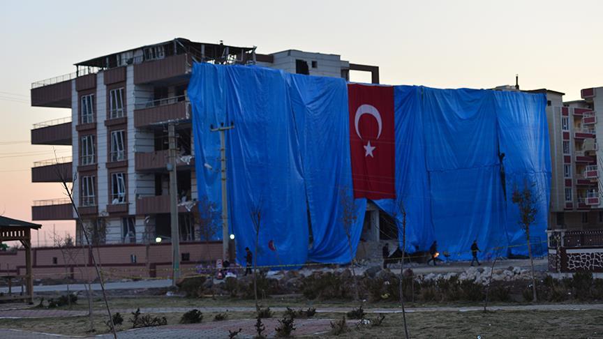 Şanlıurfa'nın Viranşehir ilçesindeki terör saldırısının ardından patlamanın izlerine silmeye çalışan vatandaşlar, evlerine Türk bayrakları asarak teröre tepki gösterdi.