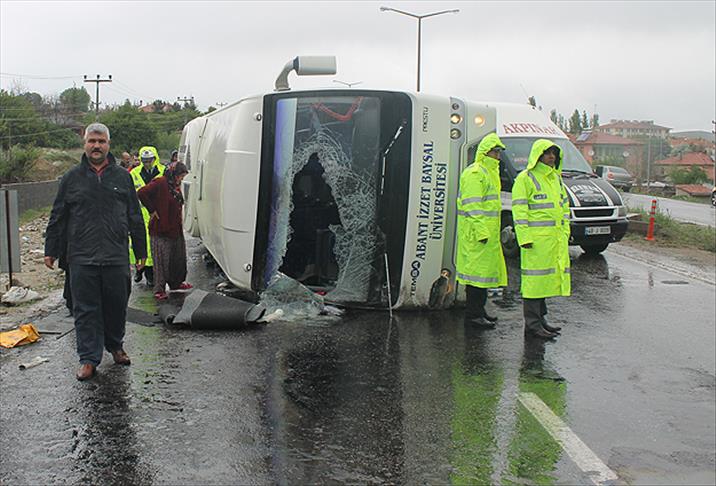 Abant İzzet Baysal Üniversitesi (AİBÜ) Yüzme Takımı sporcularının bulunduğu midibüsün, Kırşehir'in İsahocalı köyü yakınlarında devrilmesi sonucu 15 kişi yaralandı.