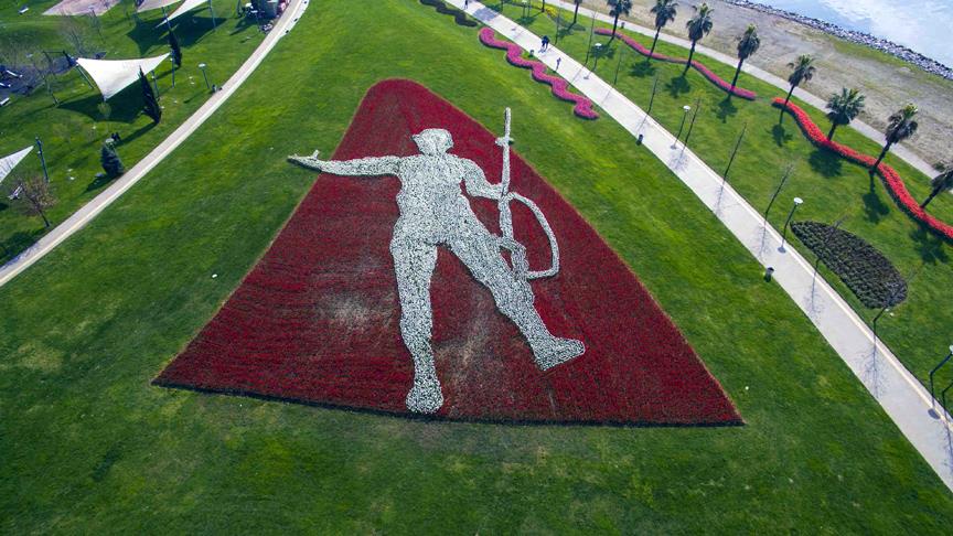 Kocaeli Büyükşehir Belediyesince Sekapark'taki bin 500 metrekare alanda, 150 bin lale kullanılarak, Mehmetçik figürü oluşturuldu.