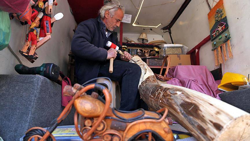 Aracının 4 metrekarelik kasasında ağaçlardan süs eşyası yapmaya başlayan Kaya, el emeği çalışmalarını şehir şehir dolaşarak satıyor.