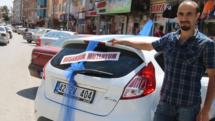 Konya'nın Seydişehir ilçesinde 3 yıl süren davanın ardından eşinden ayrılan Hayrettin Deniz, boşanmasını aracını süsleyerek kutladı.