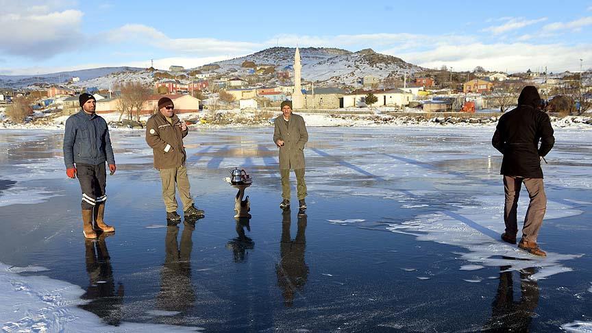 Buz kalınlığının beş santimetreyi bulduğu gölün doğu kesimine çıkan insanlar, buz üzerinde çay keyfini yaşadı.