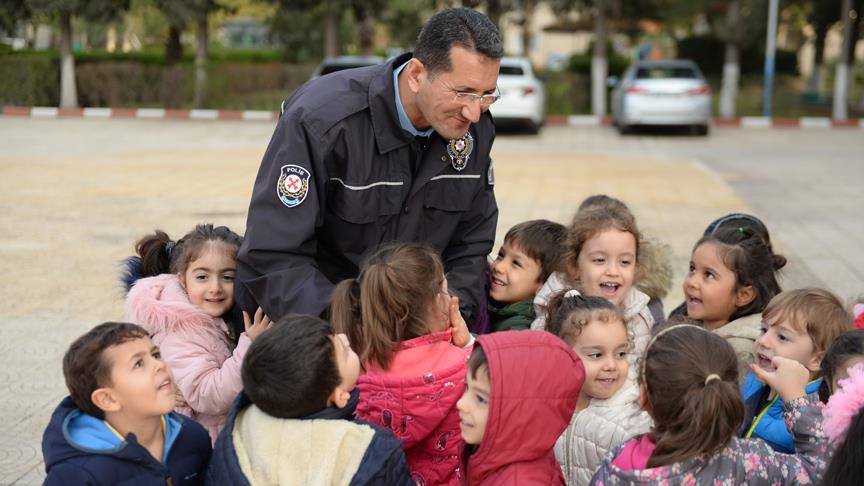 Kilis'e yaklaşık 15 yıl önce atanan ve çocuk trafik eğitimleri için okullara görevlendirilen polis memuru Fikret Karademir, eğitimlerde uyguladığı yöntemlerle kısa sürede çocukların gönlünde taht kurdu.