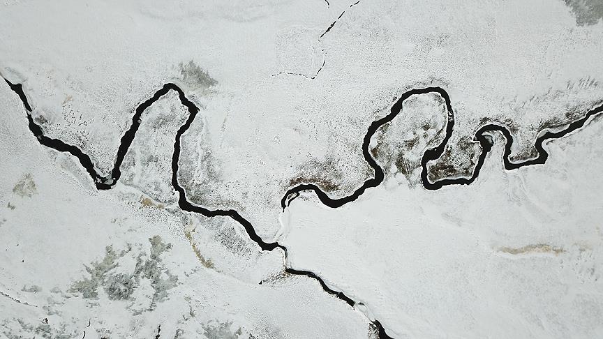 Doğu Anadolu Bölgesi'nde kar yağışı nedeniyle Iğdır'daki Ünlendi Vadisi'nden geçen derenin oluşturduğu menderesler, görsel şölen sundu.