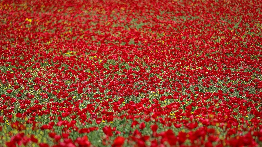 Kahramanmaraş merkezli 6 Şubat'taki depremlerden etkilenen ilçedeki tarlalar, doğada kendiliğinden yetişen gelinciklerin açmasıyla kırmızıya boyandı.