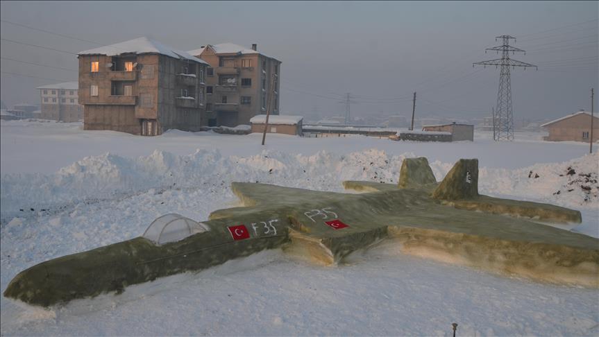 Hakkari'nin Yüksekova ilçesinde, inşaat işçisi Mehmet Şerif Karahan, kardan savaş uçağı yaptı.