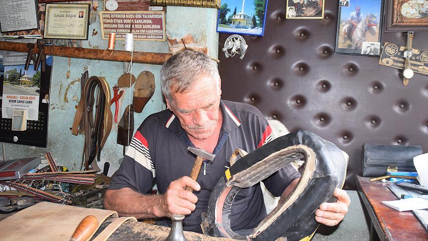 Balıkesir'in Sındırgı ilçesinde, unutulmaya yüz tutmuş saraçlık mesleğinin son temsilcilerinden 72 yaşındaki Nurettin Yılmazel, 64 senedir deriye şekil vererek koşum takımı, hamut, çoban çantası, tasma, kemer, eyer üretiyor.