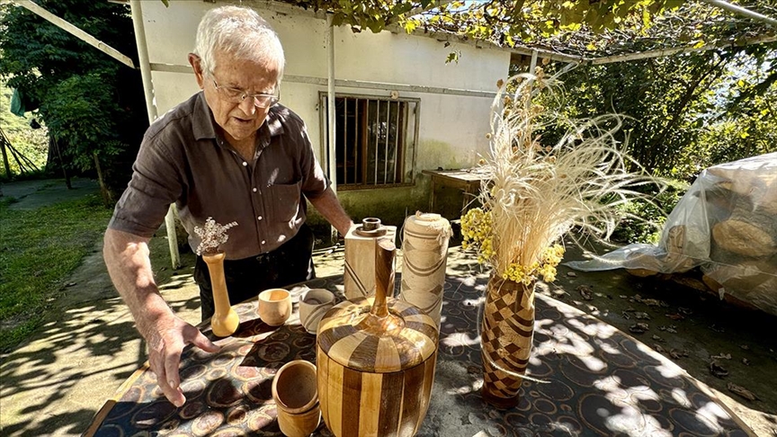 "Ahşaptan hiç kopmadım. Sonra buraya geldim kovan yaptım. Almanya'da langstroth tipi kovanlar vardı, ben de kendime onlardan yaptım. Sonra arıları oğluma verdim. Ceviz, gürgen, çam, ıhlamur ağaçları kullanıyorum. Masa, koltuk, sehpa yapıyorum. Onlar olmasa ben öldüm, onlar beni mutlu ediyor. Torna makineleri de aldım, şimdi bahtiyarım. Bu zamana kadar sattığım yok, eşe dosta hediye olarak yapıyorum."